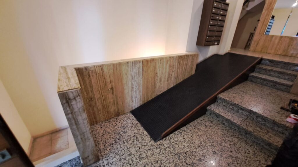En muchas comunidades de Gandía, el acceso al ascensor sigue siendo un problema diario para vecinos mayores, personas con movilidad reducida o familias que suben carros y compras. Esta comunidad no era una excepción: varios escalones impedían llegar al elevador con comodidad y seguridad.