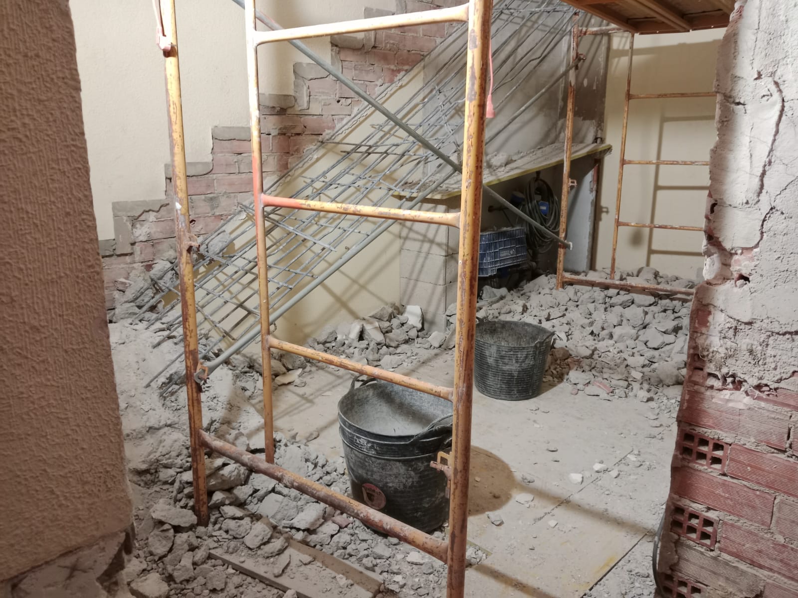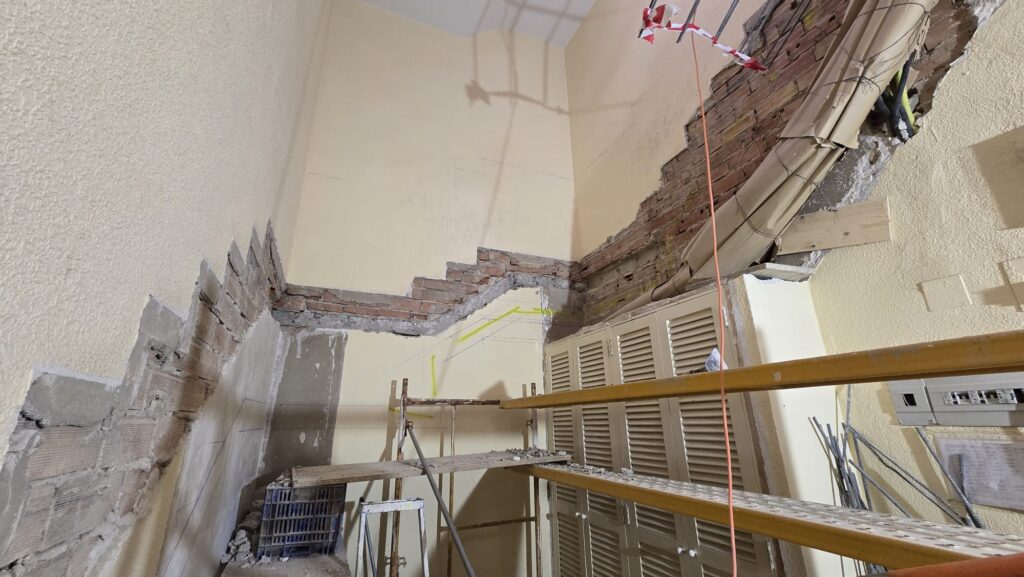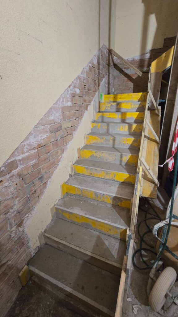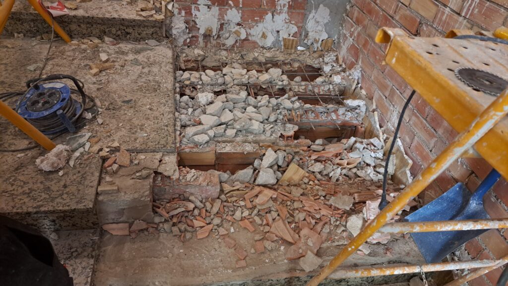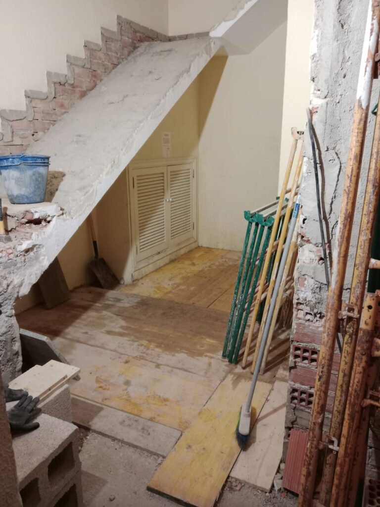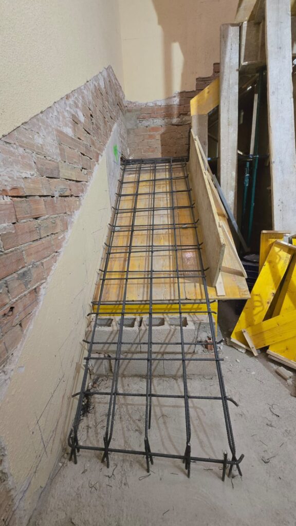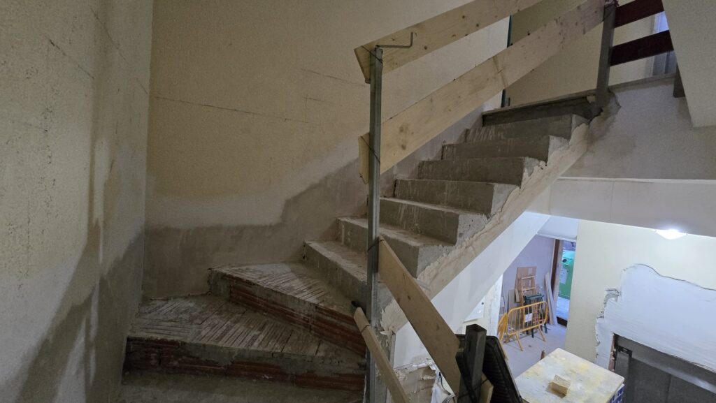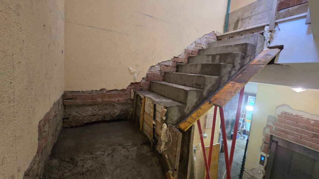 Una vez terminados los derribos, se comenzó con la reconstrucción de rellanos y peldaños. Este tipo de obra requiere precisión: cada altura y cada encuentro debe encajar perfectamente para que la futura cota 0 sea real.