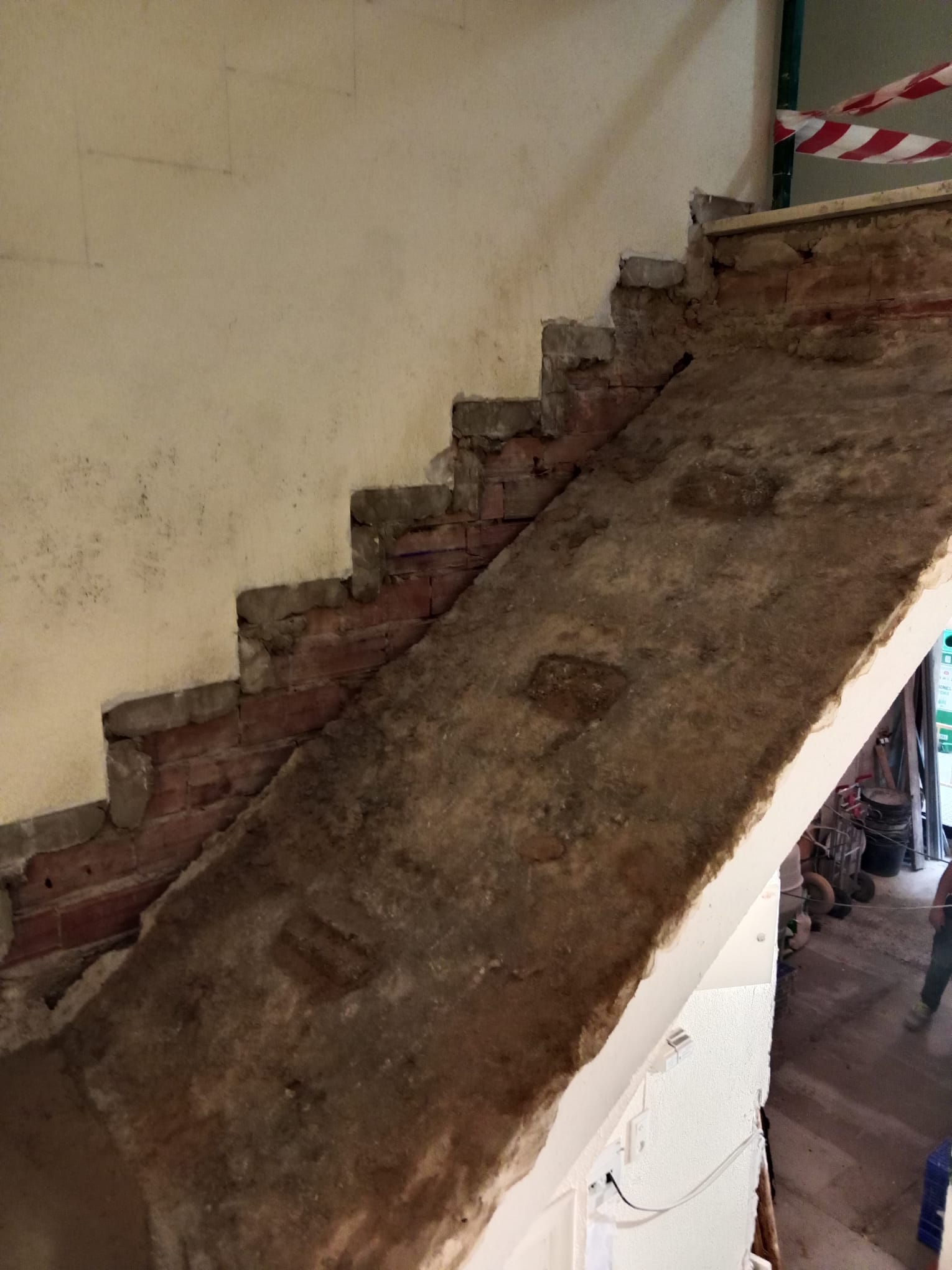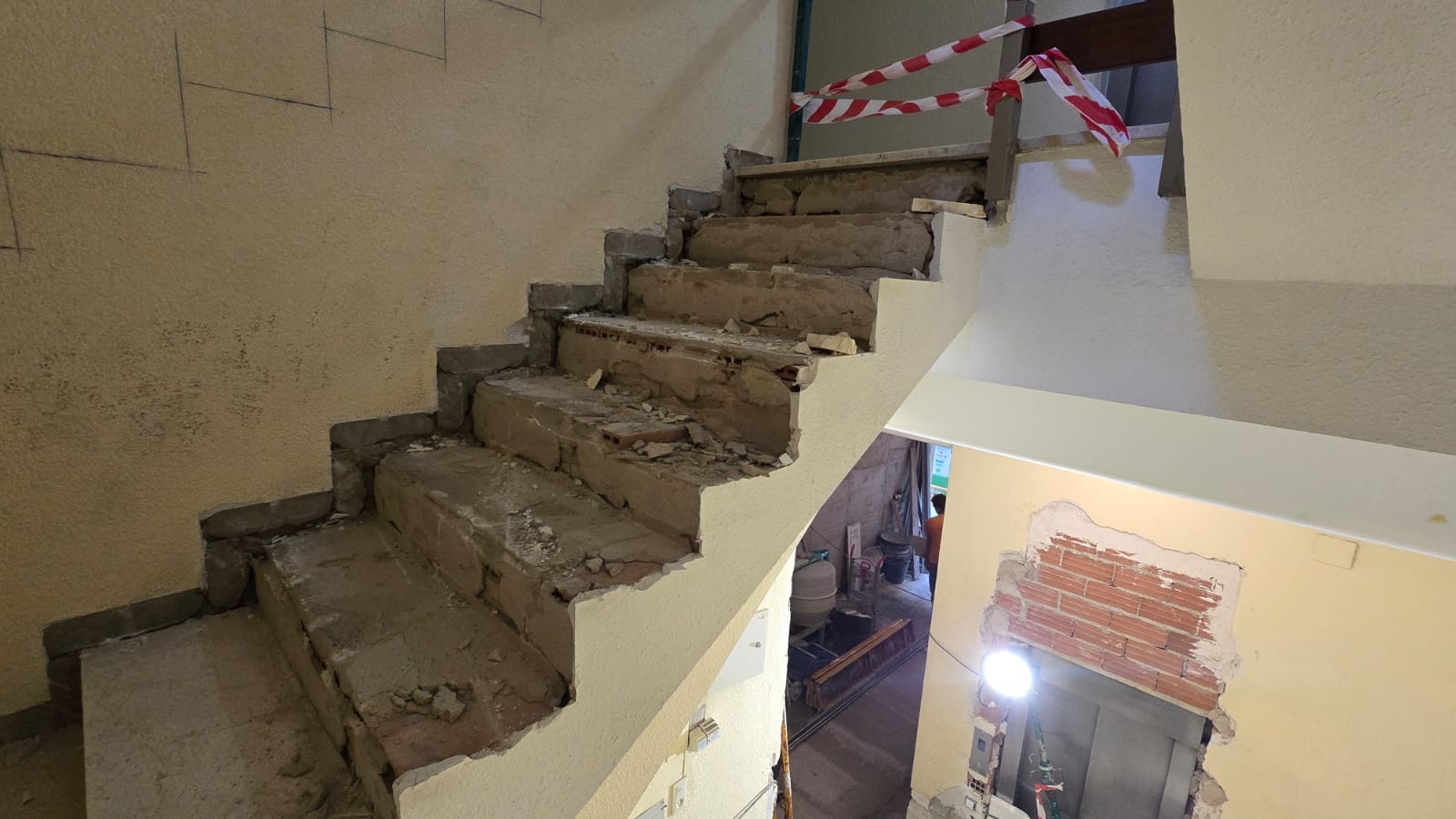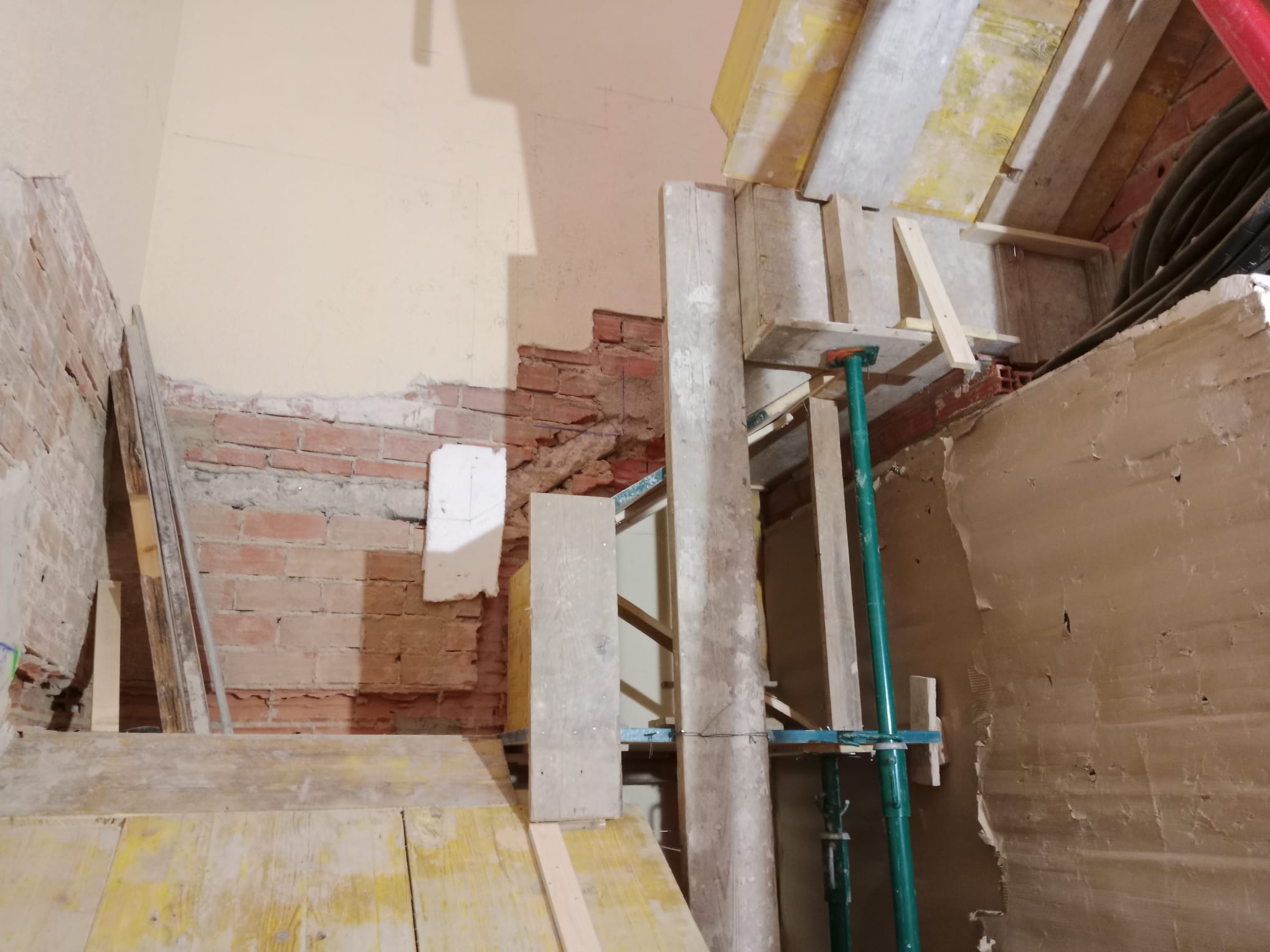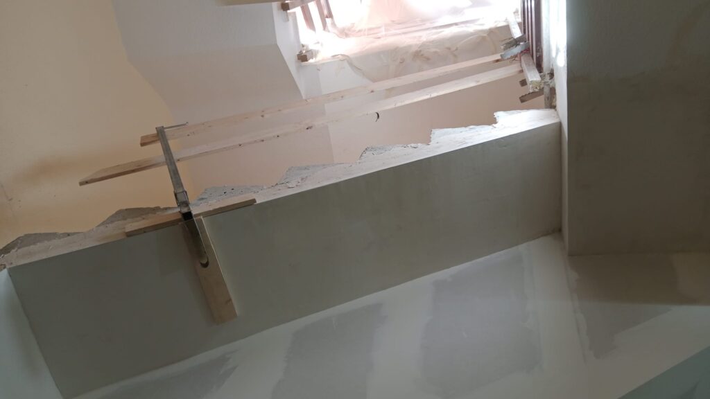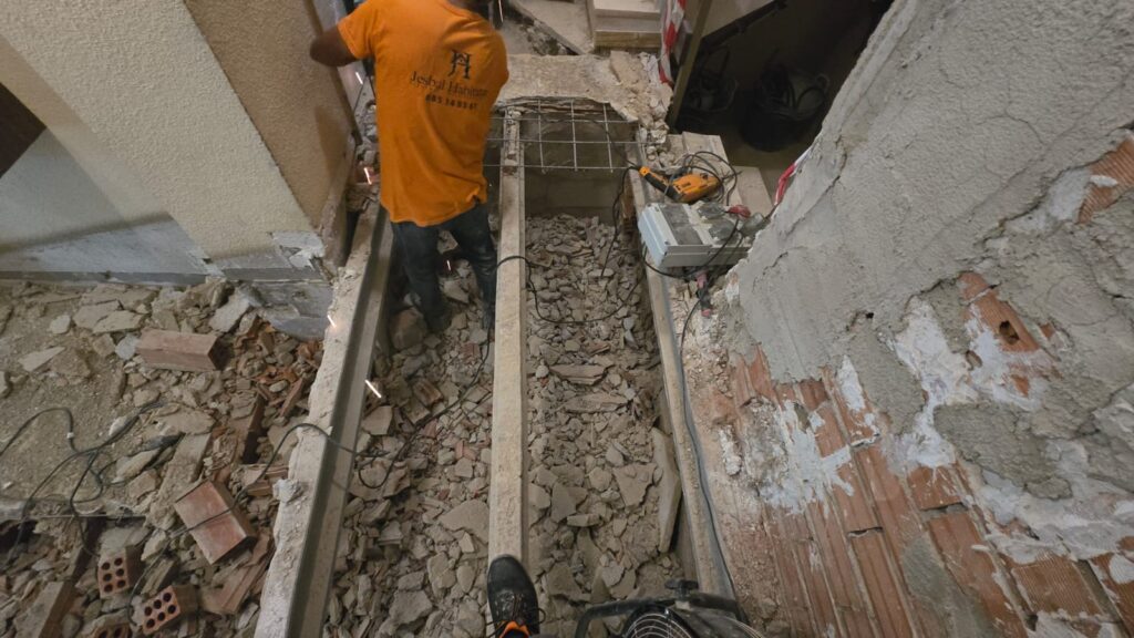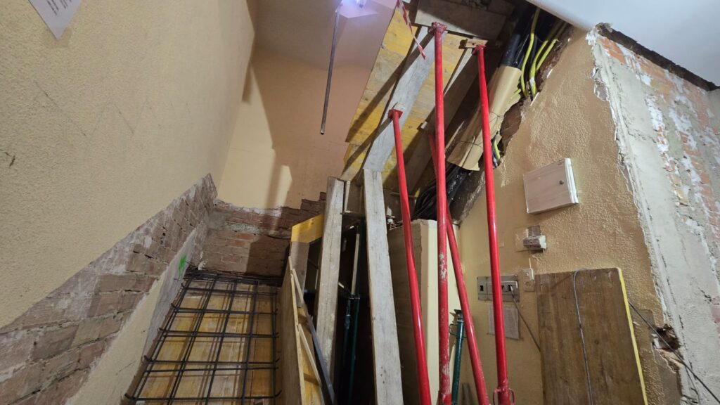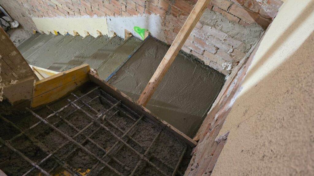 Una vez terminados los derribos, se comenzó con la reconstrucción de rellanos y peldaños. Este tipo de obra requiere precisión: cada altura y cada encuentro debe encajar perfectamente para que la futura cota 0 sea real.