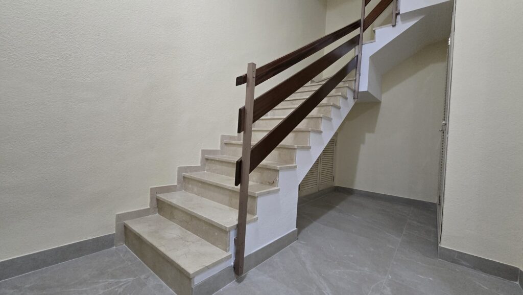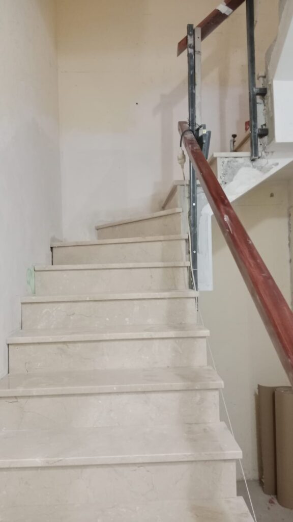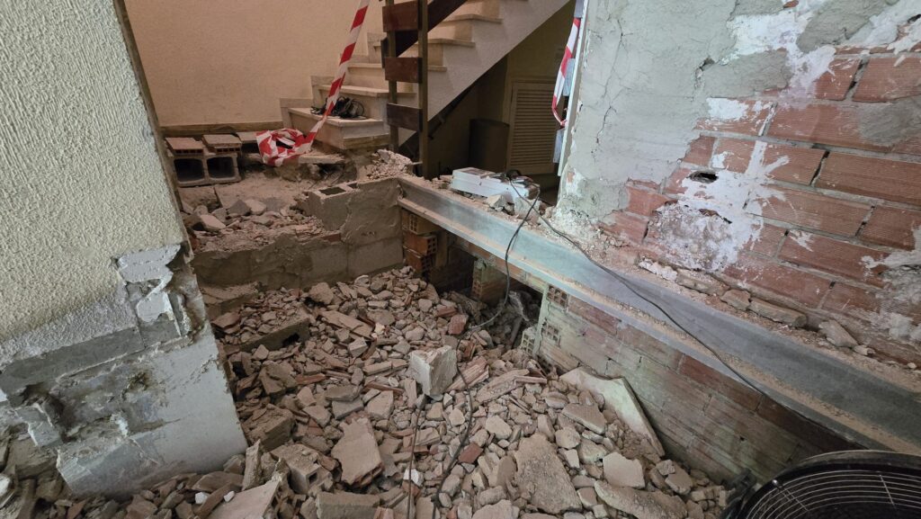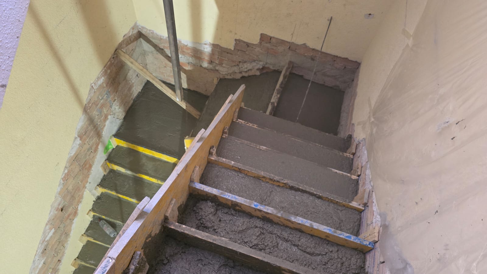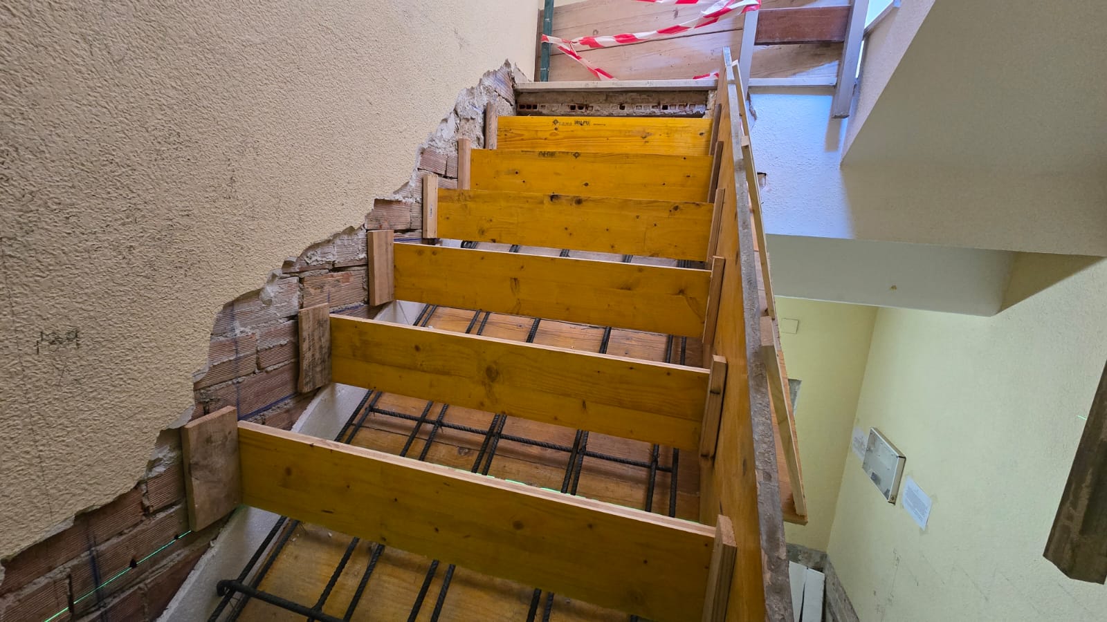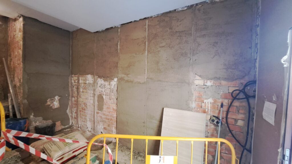 Una vez terminados los derribos, se comenzó con la reconstrucción de rellanos y peldaños. Este tipo de obra requiere precisión: cada altura y cada encuentro debe encajar perfectamente para que la futura cota 0 sea real.
