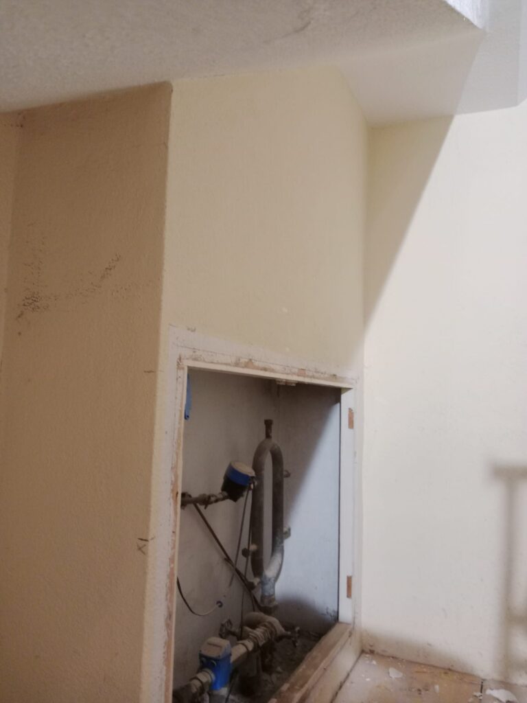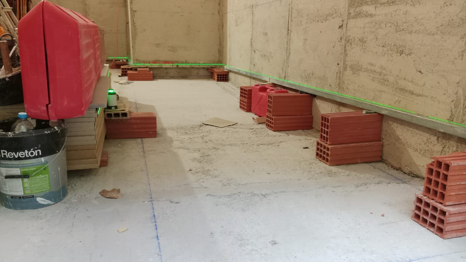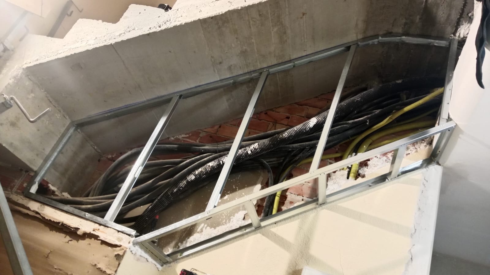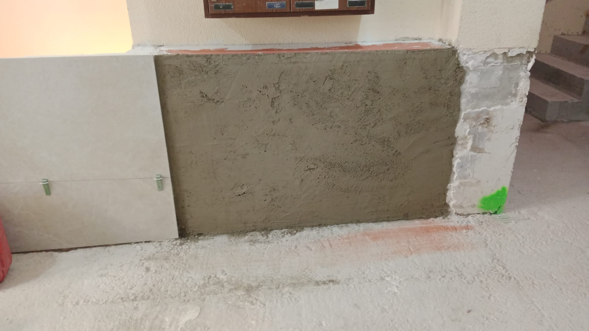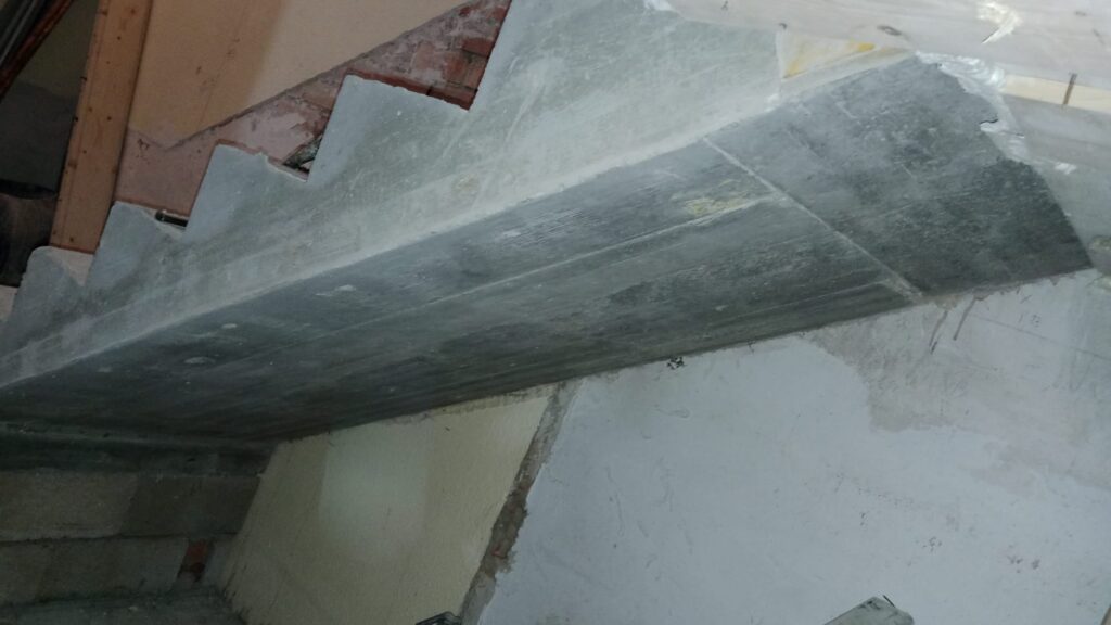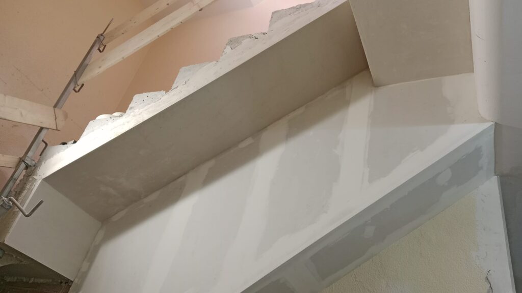 Una vez terminados los derribos, se comenzó con la reconstrucción de rellanos y peldaños. Este tipo de obra requiere precisión: cada altura y cada encuentro debe encajar perfectamente para que la futura cota 0 sea real.